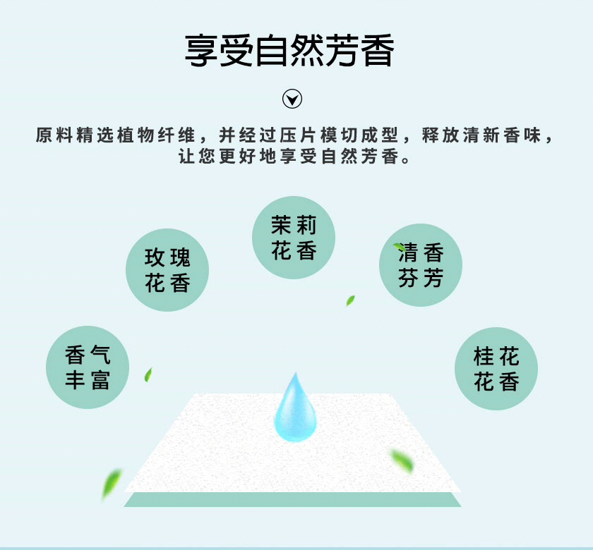享受自然芳香:原料精选植物纤维,并经过压片模切成型,释放清新香味,让您更好地享受自然芳香。