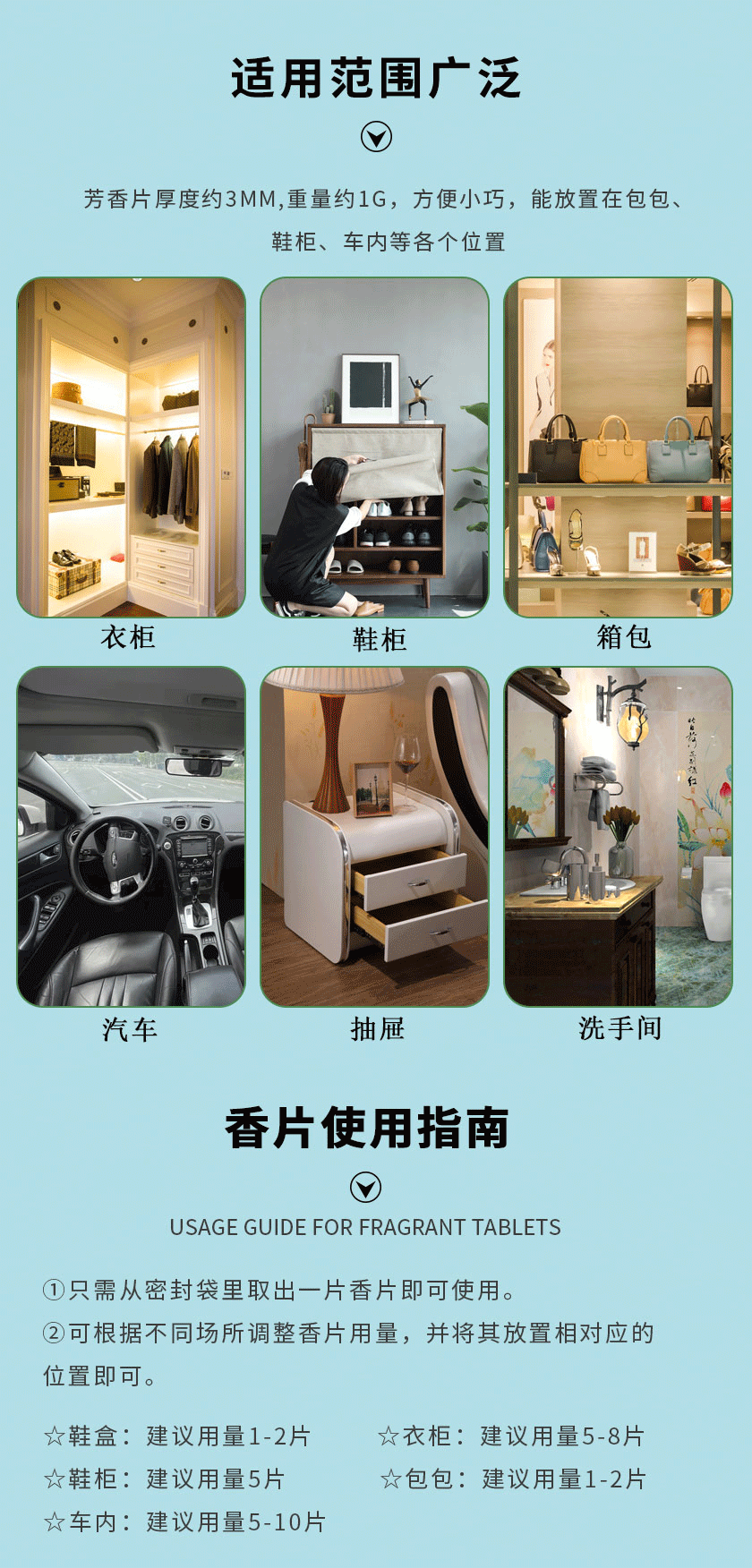 ②可根据不同场所调整香片用量,并将其放置相对应的位置即可。