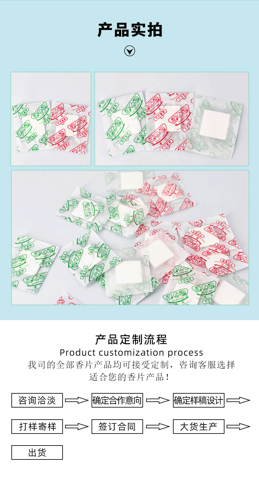 香片留香长久:香片外膜采用了热封工艺,持久耐用,锁住香味,让香片留香长久。