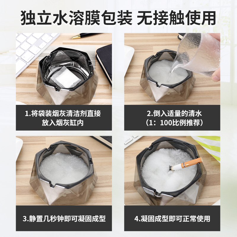【使用方法】取出一包本产品直接放入烟灰缸中,加入适量清水,静待1分钟即可使用。